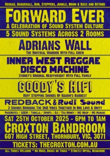 Forward Ever – A Celebration of Sound System Culture, takes place next on Saturday 25th October at The Croxton Bandroom in Thornbury with its most ambitious event to date – 5 Sounds across 2 Rooms featuring local and interstate crews.